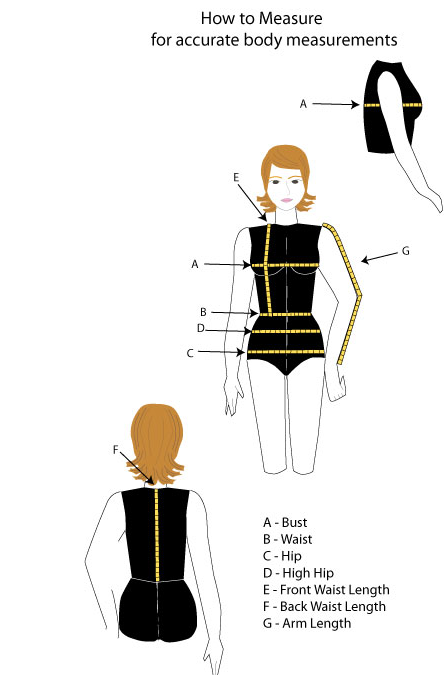 Bust: Measure the circumference of your chest. Place one end of the tape measure at the fullest part of your bust, wrap it around (under your armpits and back to the front) to get the measurement.